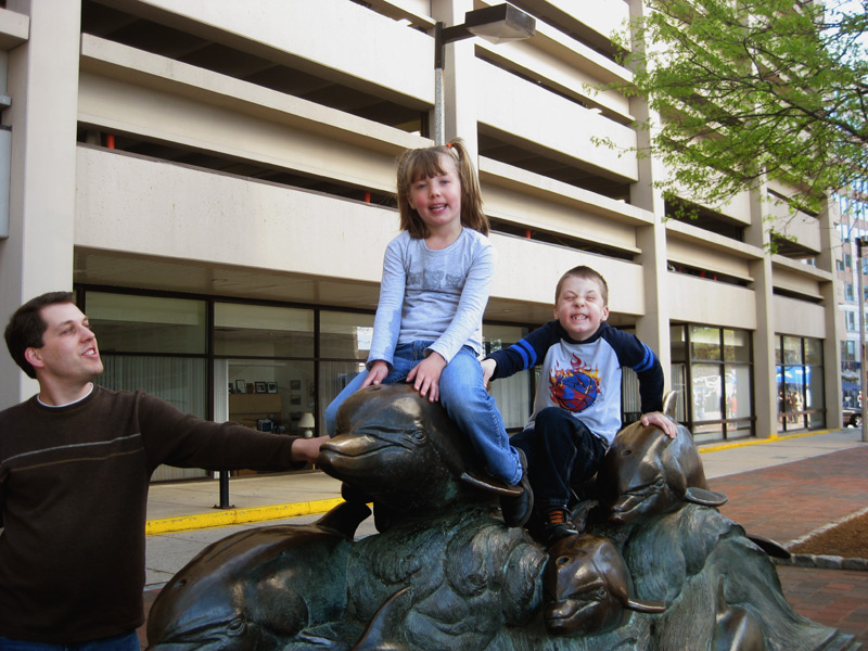 A couple of weekends ago, we took the kids to the Boston Aquarium on a whim. Unfortunately, none of the picture from inside the aquarium came out at all, but we did get this one from out in front of the aquarium. The kids really enjoyed seeing all the animals. They had a cool touch tank where the kids got to pet the rays. Sean really loved the jellyfish exhibit, too. It was crowded as all get-out, but we all really enjoyed it.
