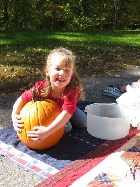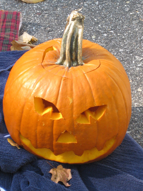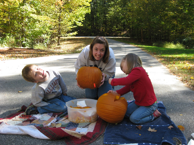 We carved pumpkins last weekend. This time we played it smart, and did it outside so that we didn't get pumpkin innards all over everything. As we were scraping out all of the guts, Sean kept whispering in my ear that we should make his pumpkin so scary that Carter would scream and run away. So cute.