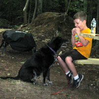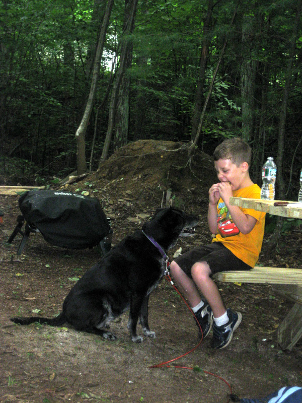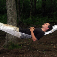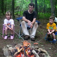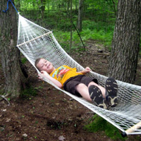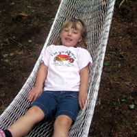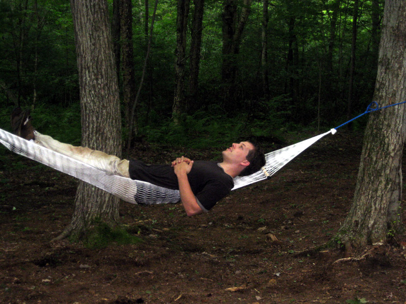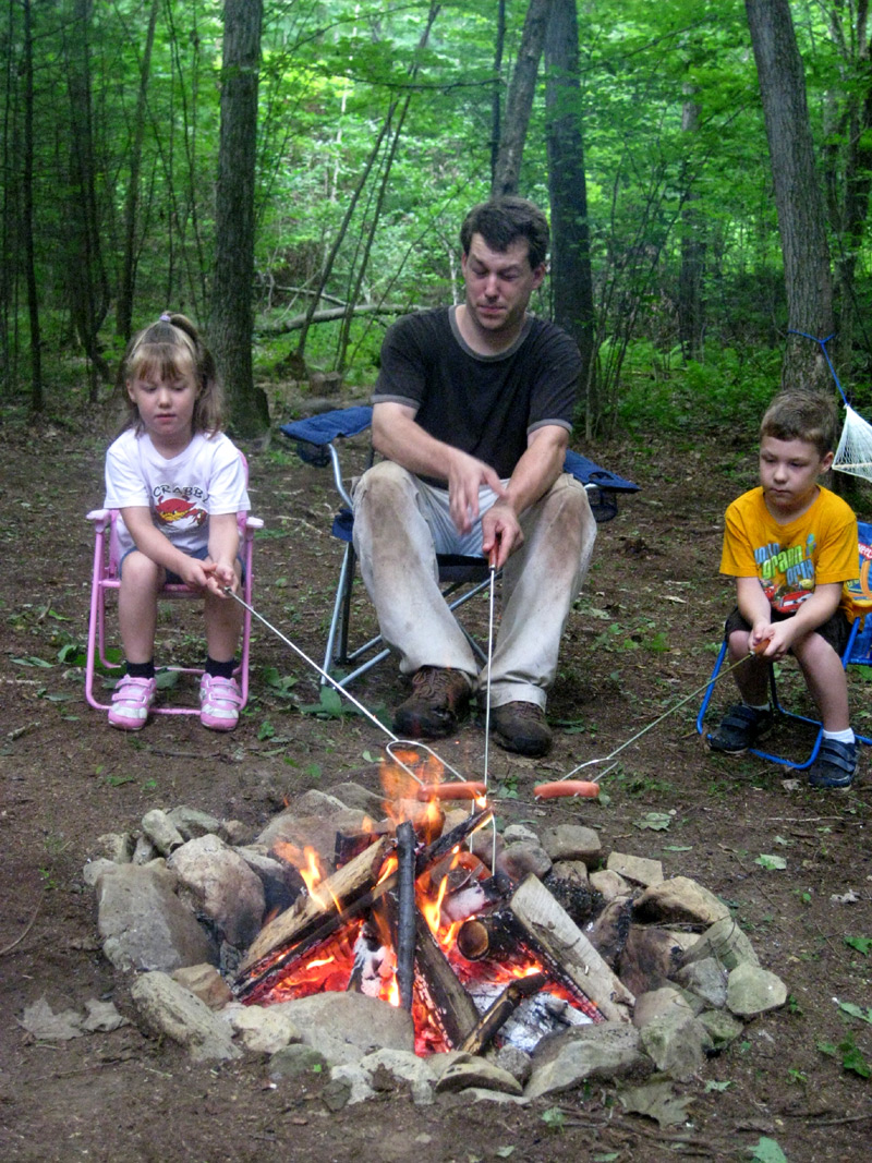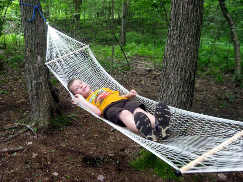 On Sunday, I convinced the fam to come back to the cabin site with me and spend an hour or two hanging out. We got a fire going in the fire pit, and cooked some hotdogs and s'mores. I had put up a cheapo hammock that morning, and everyone got a chance to try it out. At the same time, I finished putting the tar paper and drip edge on the roof. This coming weekend I'll be able to get the roof shingled, and then the roof will finally be done! Yay - I won't need to spend any more time standing on a ten-inch wide board fifteen feet from the ground!