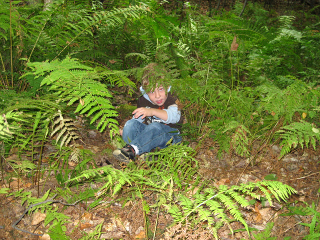 Last weekend we took a walk in the woods in back of the house. I've been out there plenty of times to explore out lot, and see what there is to see. But last Sunday I suddenly realized that I have actually never taken the kids out there just to explore. So Lori, the kids and I all headed out for an 'adventure'. Sean kept hiding in the ferns and asking if we could still see him - he's been very interested in the concept of 'camouflage' lately. Carter was interested in all of the different trees, but needed to be carried every time we came to any dense brush. For here, all those pointy plants and thorns were eye-high!